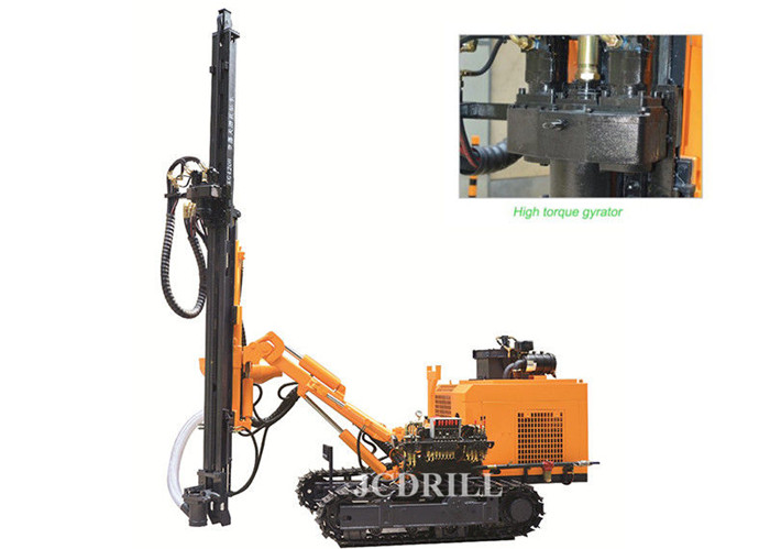The KG420 down the hole drill rig for open use is an improved device in compliance with national regulations in diesel-engine emissions. Equipped with Yuchai four-cylinder engine (China 3), the drill rig meets national standards for emissions and environment. The folding frame track, four-wheel drive and tramming motor of plunger piston improve the working pressure and climbing capacity, the expanded pith and lifting-arm hydraulic cylinder enable it to meet the requirements on extreme position. The double-motor rotation increases the rotary torque and revolving speed; and the lifting hydraulic cylinder and chain are expanded to promote the lifting force and reliability. The thickened profile folder is used for the housing, thus improving its level of intensity and rigidity, and the additional ring makes handling and lifting convenient.